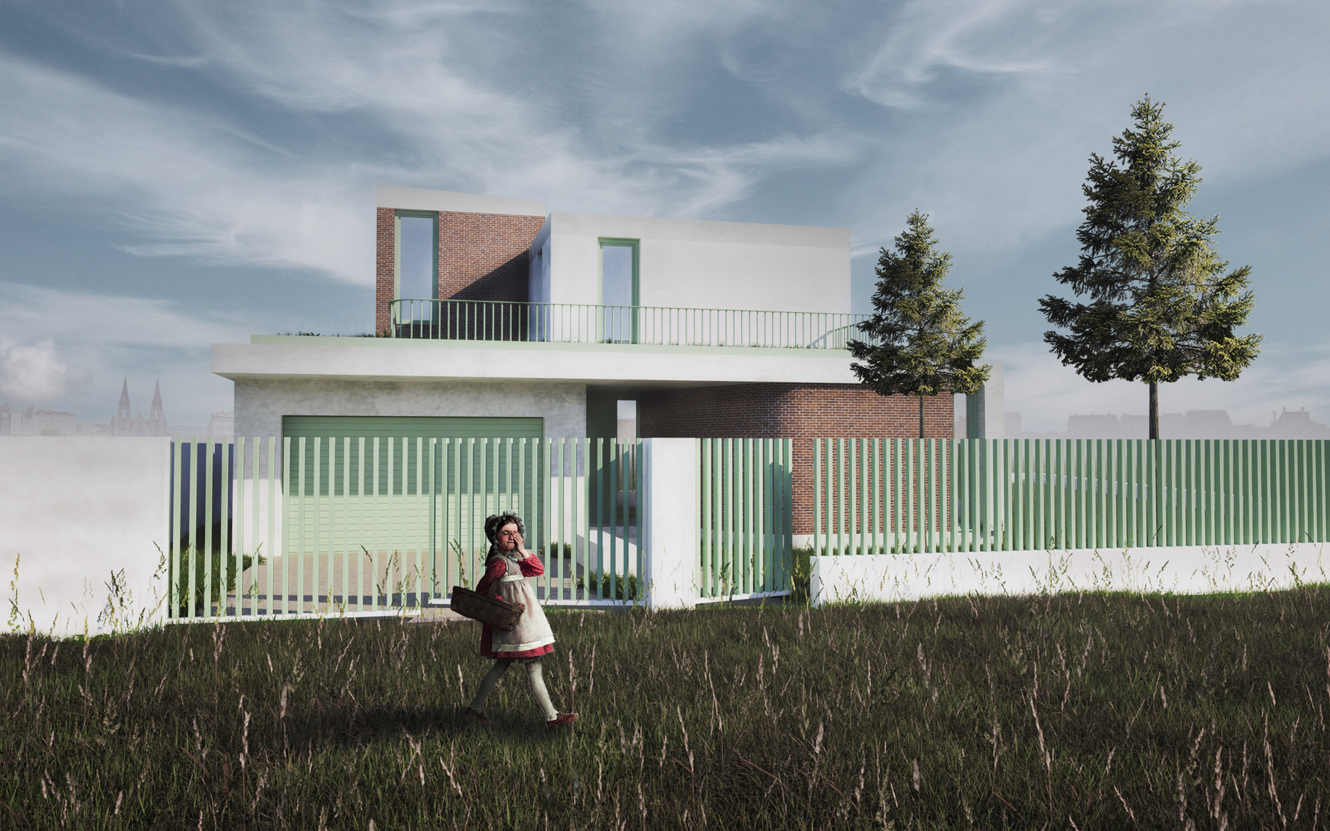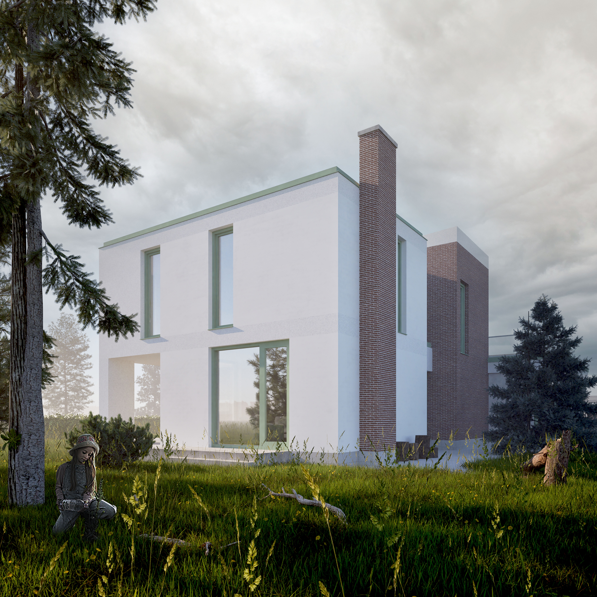 Exteriorul casei, tratat predominant monocrom, are un aspect cald și natural datorită accentelor de cărămidă folosite pentru volumul casei de scară, horn și peretele curb care marchează intrarea.