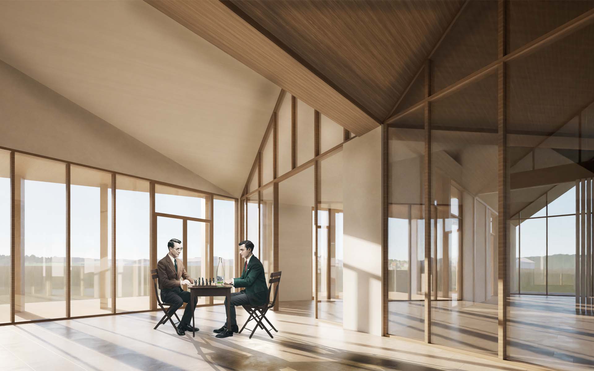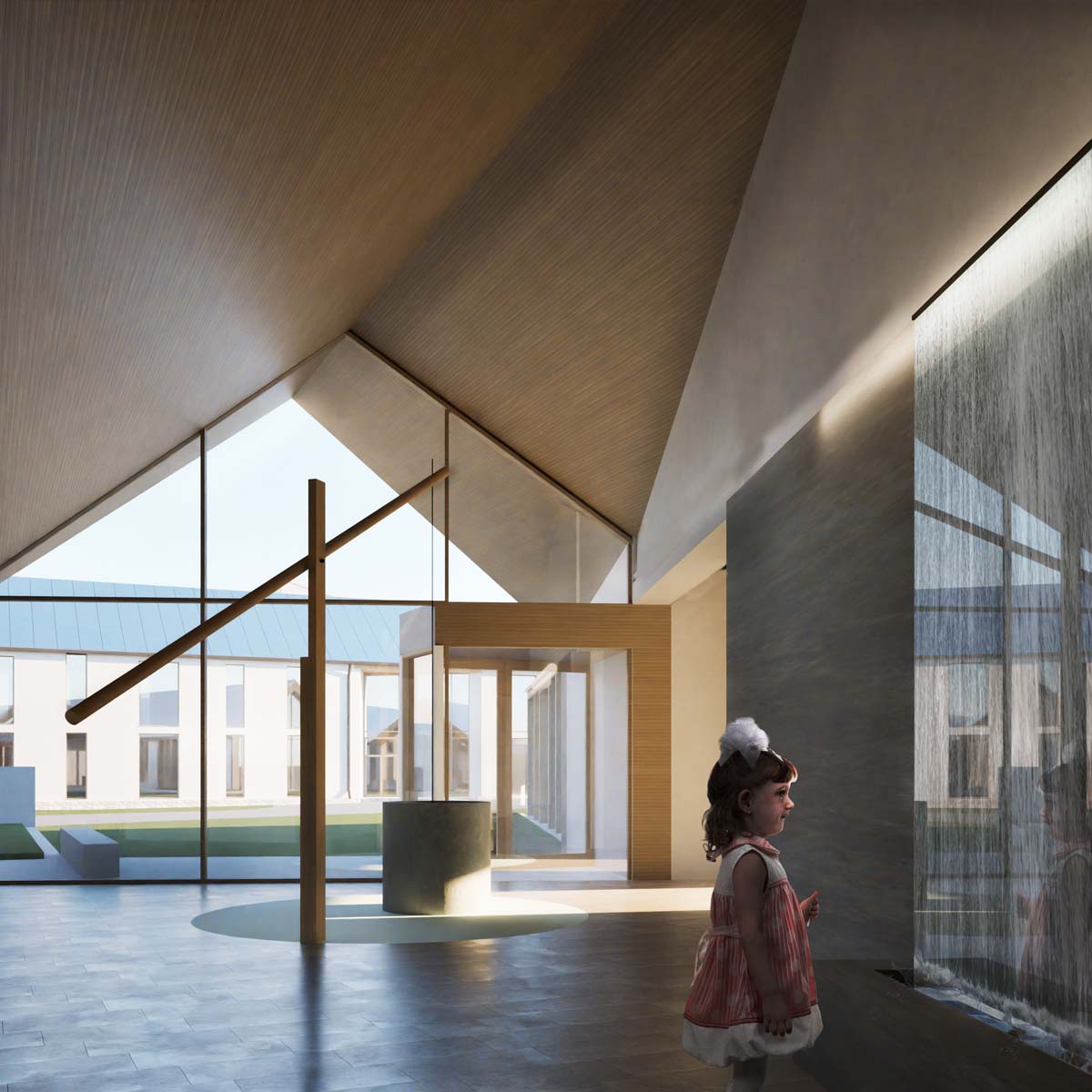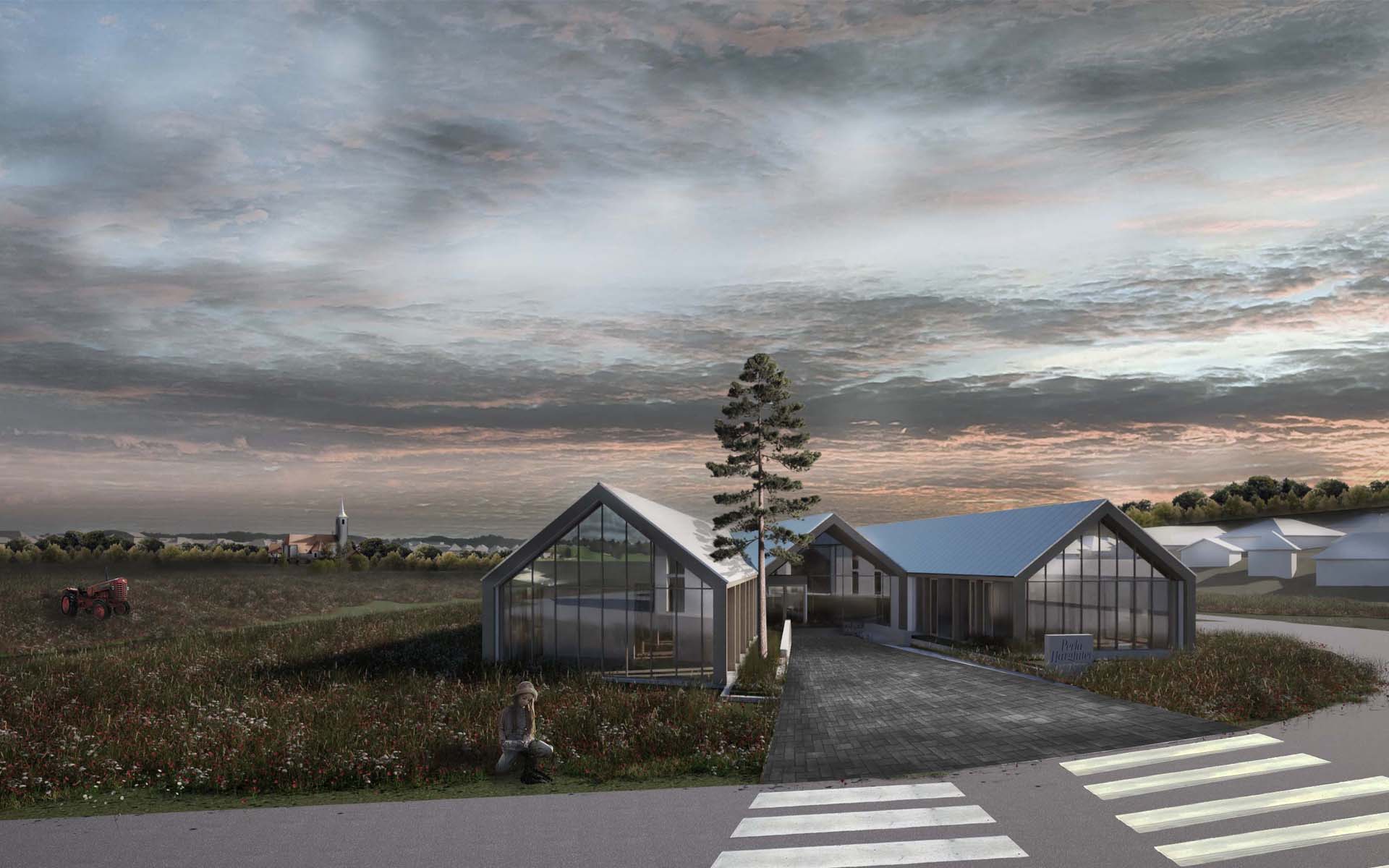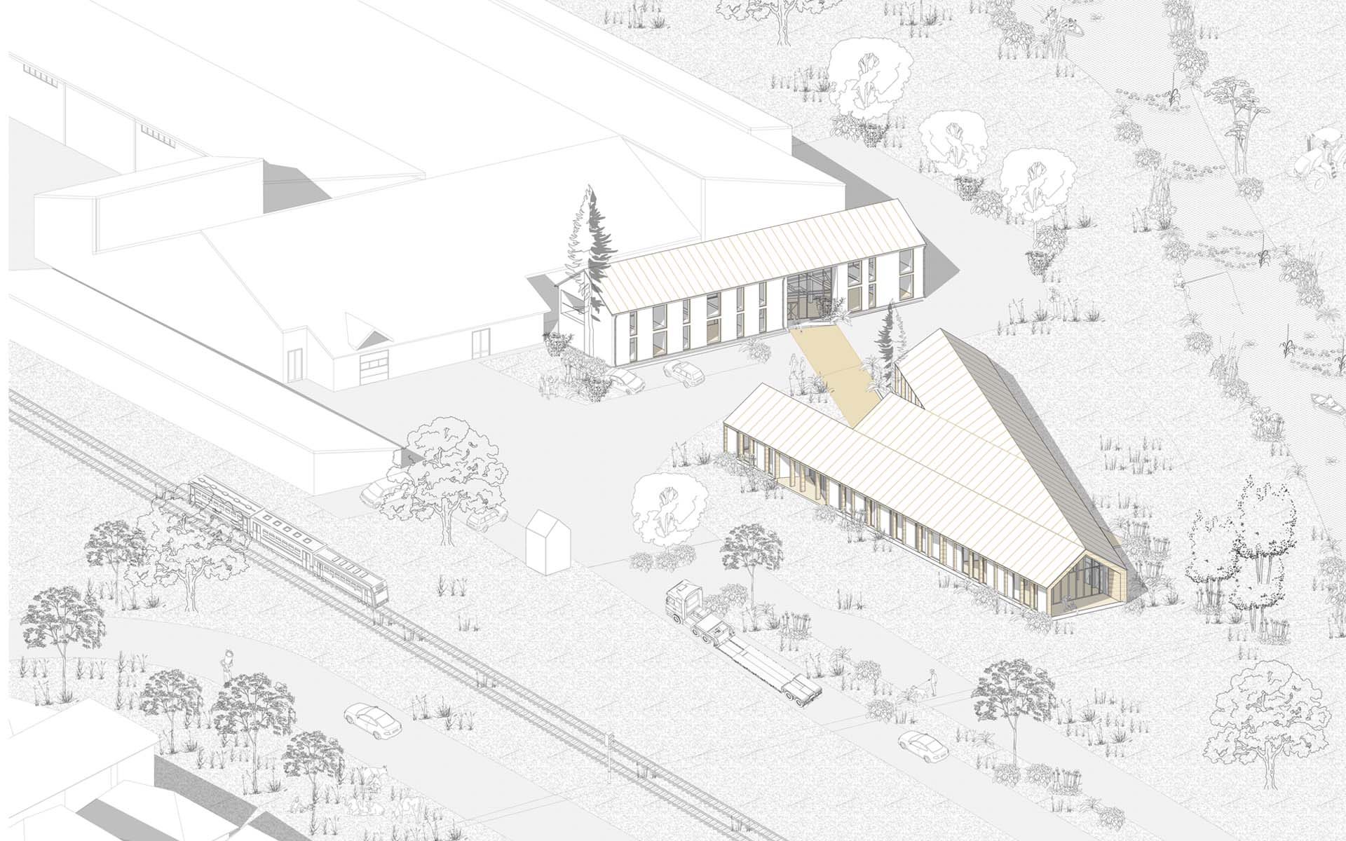 Folosind secțiunea arhaică a acoperișului unei case, cele trei volume ale clădirii propuse sunt poziționate convergent către punctul de acces pe sit.